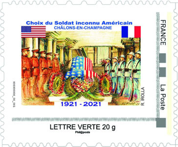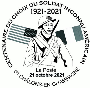 Le 24 octobre 1921, dans le hall de l’Hôtel de ville de Châlons-sur-Marne (aujourd’hui Châlons-en-Champagne), le soldat inconnu américain fut choisi au hasard, parmi quatre dépouilles exhumées de cimetières militaires de la Première Guerre Mondiale, par le sergent Edward F.Younger, héros de guerre. Dans le cadre des cérémonies de ce centenaire, l'Association Philatélique Champenoise a fait éditer deux timbres personnalisés à tirage limité. Ces figurines ont été crées par l'artiste dessinateur-graveur Roland IROLLA. Ils ont été apposés sur une carte souvenir et un encart philatélique mis en vente le jeudi 21 octobre et le vendredi 22 octobre 2021, dans le hall d'accueil de l'Hôtel de Ville, place Foch à CHALONS-EN-CHAMPAGNE.